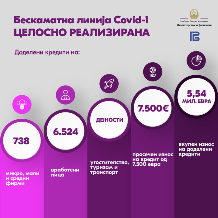Целосно е реализирана првата бескаматна линија кредити за поддршка на ликвидноста на микро, малите и средни претпријатија од најзагрозените сектори – угостителство, туризам и сообраќај, објави министерката за финансии Нина Ангеловска на својот фејсбук профил.