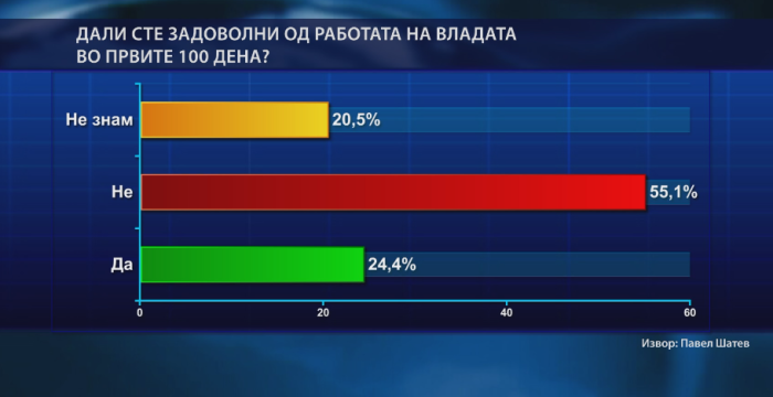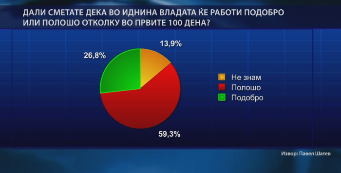 55.1 процент од анкетираните одговориле дека не се задоволни од работата на новата влада во првите 100 дена, а 59.3 отсто очекуваат таа да работи полошо во иднина.