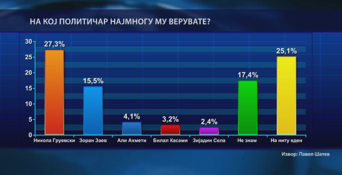 Никола Груевски има најголема доверба од 27,3 отсто од граѓаните, а Зоран Заев ја ужива поддршката од 15.5 проценти од анкетираните. Далеку зад нив е Ахмети со 4.1 отсто доверба, Билал Касами со 3.2, Села 2.4, Мендух Тачи со 1.1 и Љубчо Георгиевски во кого веруваат само 0.1 отсто од испитаниците.