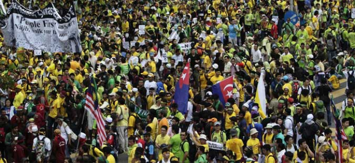 Илјадници демонстранти облечени во жолто денеска протестираа во центарот на главниот град на Малезија, Куала Лумпур, барајќи оставка од премиерот Наџиб Разак поради обвиненијата за корупција.