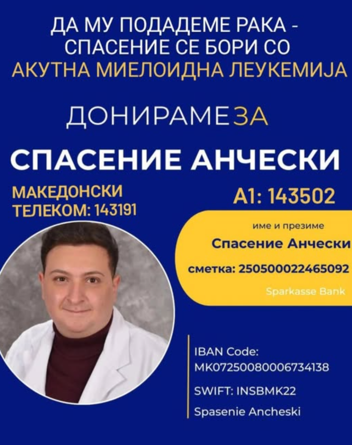 Студентот по медицина Спасение Анчески од Скопје се соочува со сериозна здравствена состојба – акутна миелоидна леукемија (АМЛ).