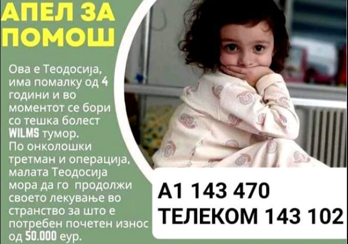 Апел за помош на тригодишната Теодосија Лазаревска, која има потреба од продолжување на започнатото лекување на тешка болест WILMS тумор во Турција, за што се потребни почетни 50.000 евра.