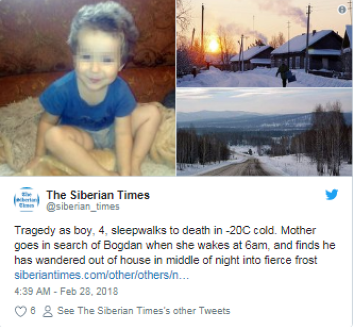 Малиот Богдан кој кобната ноќ тргнал кон куќата на соседите, месечарел и претходно, но тоа се случувало летно време, кога температурите во регионот на Краснојарск се повисоки.