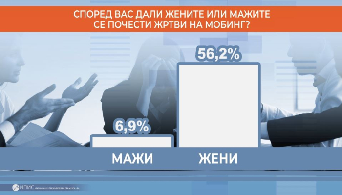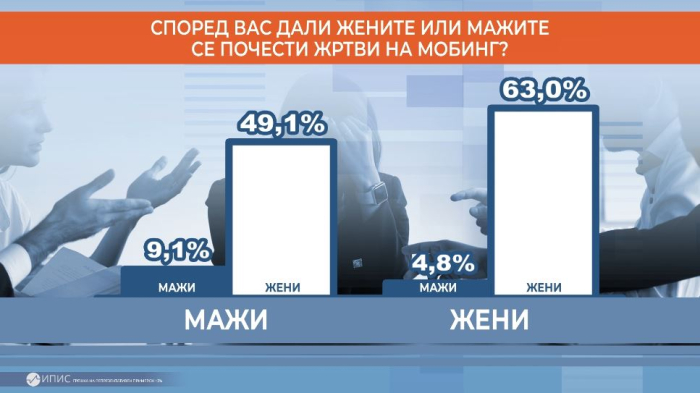 56,2% од анкетираните сметаат дека жените се почести жртви на мобинг, покажува последното истражување на јавното мислење кое за Детектор го спроведе ИНститутот за политички истражувања Скопје. Според него, само 6,9% од граѓаните се убедени дека мажите почесто се жртви на мобинг. И мажите и жените немаат многу дилеми околу ова прашање.