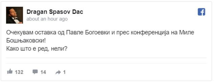 -Очекувам оставка од Павле Богоевки и прес конференција на Миле Бошњаковски! Како што е ред, нели, напиша Спасов Дац на својот Фејсук профил.