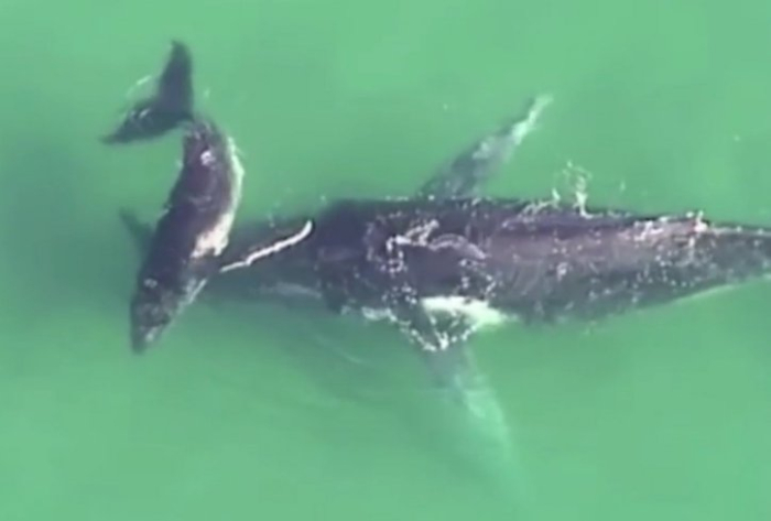 Женка на грбав кит се насукала во плиткото кај австралискиот брег, но успеа да преживее благодарение на своето малечко.