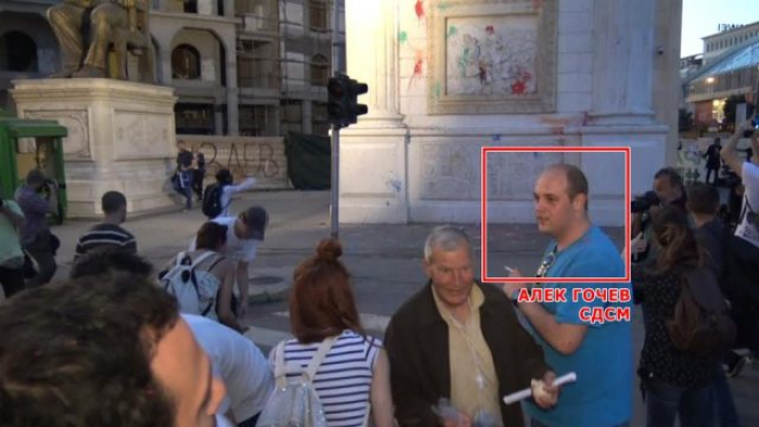 Во хулиганството, нападот на полицијата, сквернавењето на Порта Македонија, Министерството за култура – објект од триесетите години на минатиот век и низата напади учествуваше Алек Гошев, член на СДСМ и НВО „Аман“.