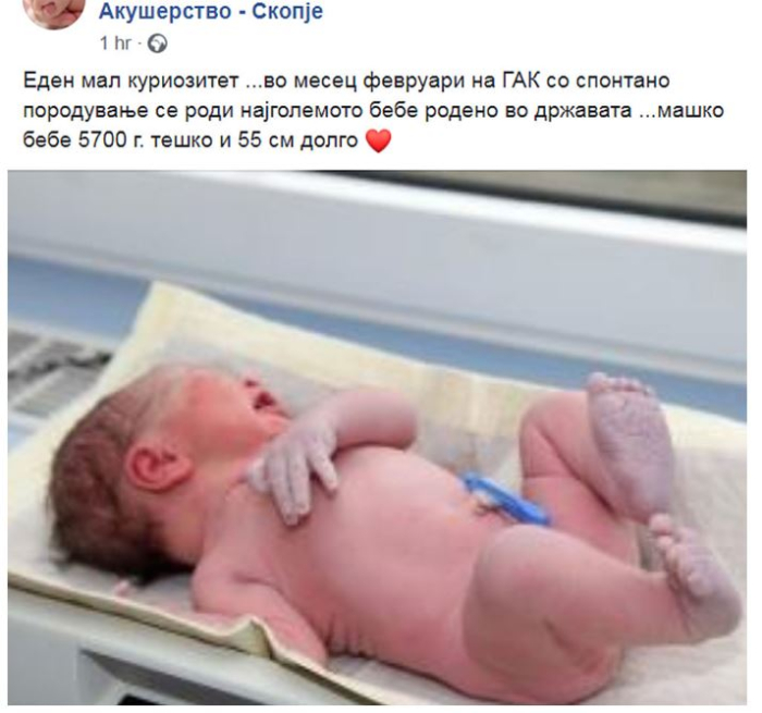 – По објавата на ФБ, ГАК попладнево со соопштението дава повеќе детали за најголемото машко бебе, тешко 5.700 грама и долго 55 сантиметри, кое се роди изминатиот месец по природен пат.