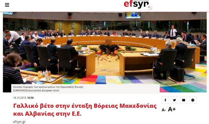 „Самит на ЕУ: Три земји го блокираа почетокот на пристапни преговори со Северна Македонија и Албанија“; „Француско вето за интеграција на Северна Македонија и Албанија во ЕУ“; „Блокада од Франција за почеток на пристапни преговори со Северна Македонија и Албанија“; „Стоп од Макрон за Скопје и Тирана во ЕУ“; „Мицотакис и Ципрас поддржуваат интеграција на Северна Македонија и Албанија во ЕУ“; „ЕУ без договор за преговори со Северна Македонија и Албанија“, се дел од насловите во онлајн изданијата на медиумите во Грција.
