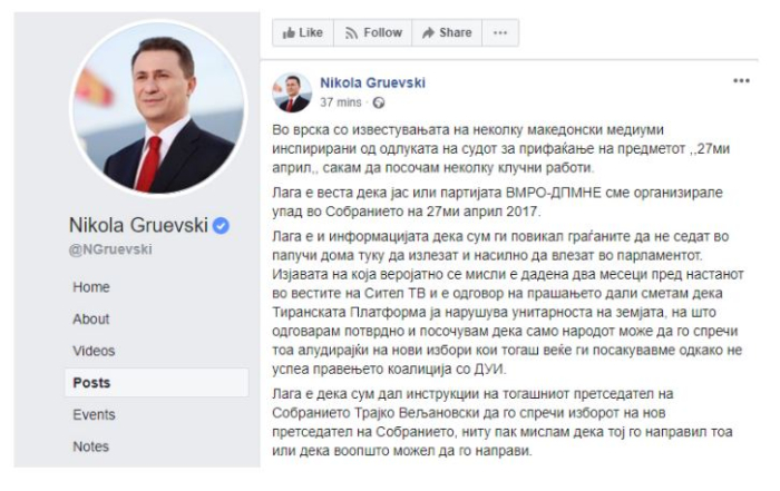 Лага е веста дека јас или партијата ВМРО-ДПМНЕ сме организирале упад во Собранието на 27ми април 2017, наведе вечерва на неговиот фејсбук профил поранешниот премиер Никола Груевски, откако Обвинителството за гонење на организиран криминал и корупција го објави обвиниението, според кое тој, Трајко Вељановски, Миле Јанакиевски, Спиро Ристовски, Владимир Атанасовски и Никола Бошковски, во 2017 година по неуспешните преговори за формирање Влада изготвиле план со намера да го загрозат уставниот поредок и безбедноста на земјата.