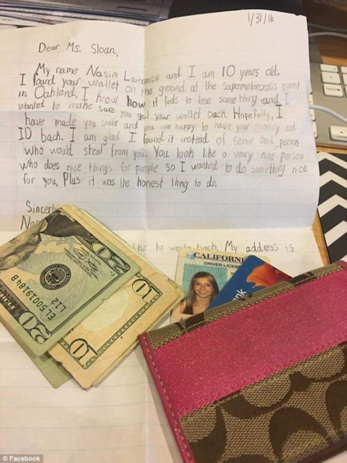 Тејлор Слоан си го загубила својот паричник во кој имала малку пари, лична карта и картички од банка. Пријатно се изненадила кога 10 годишно момче и го вратил паричникот кој случајно го пронашол. Освен што постапил многу исправно, пратил и писмо кое ја развеселило.