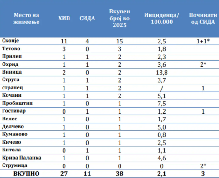 Триесет и осум пријави за новорегистрирани лица со ХИВ/СИДА во Македонија се пристигнати оваа година, заклучно со 27 ноември, според податоците што ги објави Институтот за јавно здравје во извештајот објавен по повод 1 декември, Светски ден за борба против СИДА.