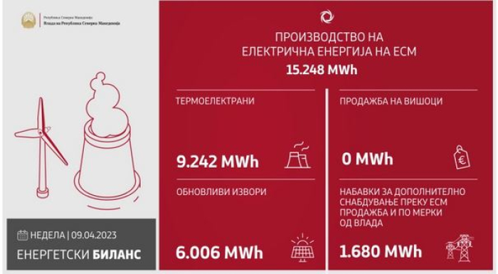 При тоа, како што посочуваат, во термоелектраните се произведени 9.242, а во хидроелектраните и во Ветерниот парк Богданци 6.006 мегават часови електрична енергија.