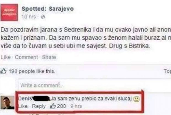- Да го поздравам пријателот од Сереник и да му вака јавно, но анонимно кажам и признаам дека сум спиел со жена му. Извини брат, но повеќе неможам да го чувам тоа во себе, ме уби совеста. Друагар од Бистрик, напишал анонимниот човек на Фејсбук страницата Spotted: Sarajevo.