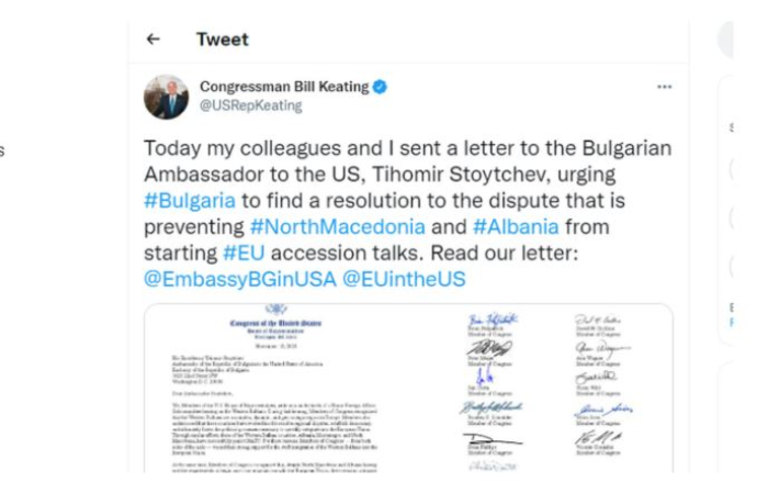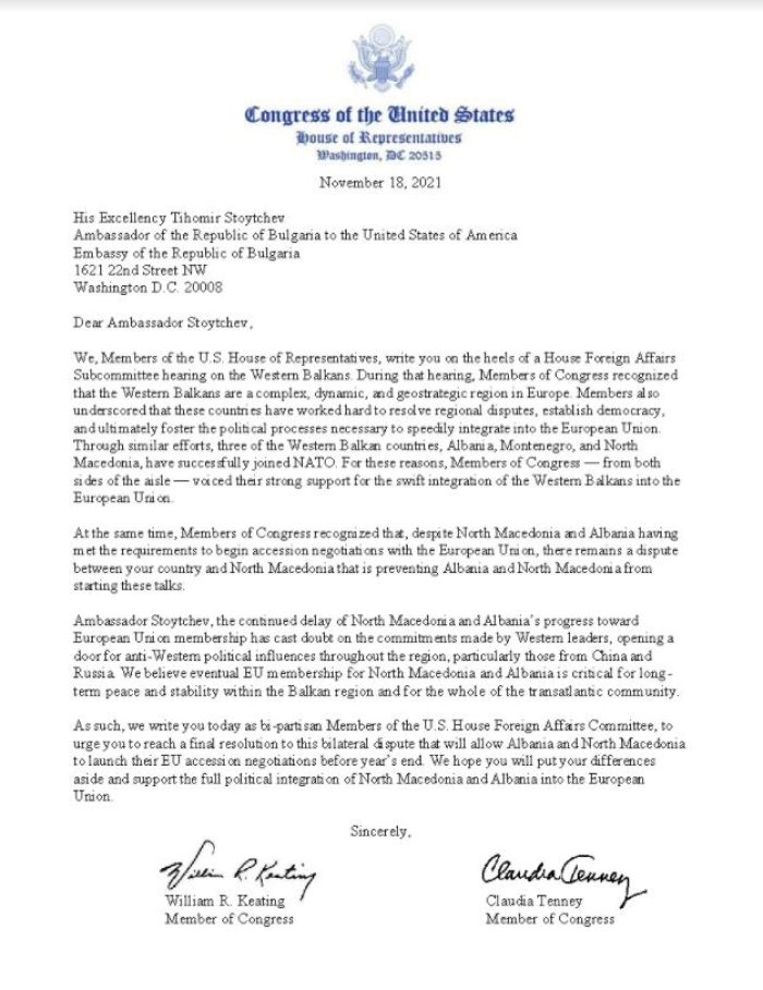 Да се реши билатералниот спор меѓу Софија и Скопје за да може Северна Македонија да ги почне преговорите со Европската унија до крајот на годината. Такво барање упатија конгресмени од Комитетот за надворешни работи на Претставничкиот дом на САД до бугарскиот амбасадор во Вашингтон.
