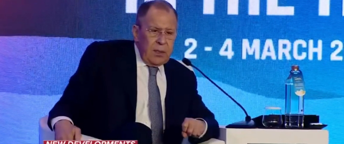 На прашањето како конфликтот влијае на енергетската стратегија на Русија, рускиот министер за надворешни работи Сергеј Лавров одговори дека војната што се обидуваат да ја запрат е започната против нив и дека Западот го искористил украинскиот народ за тоа. Публиката се насмеа на таа изјава.