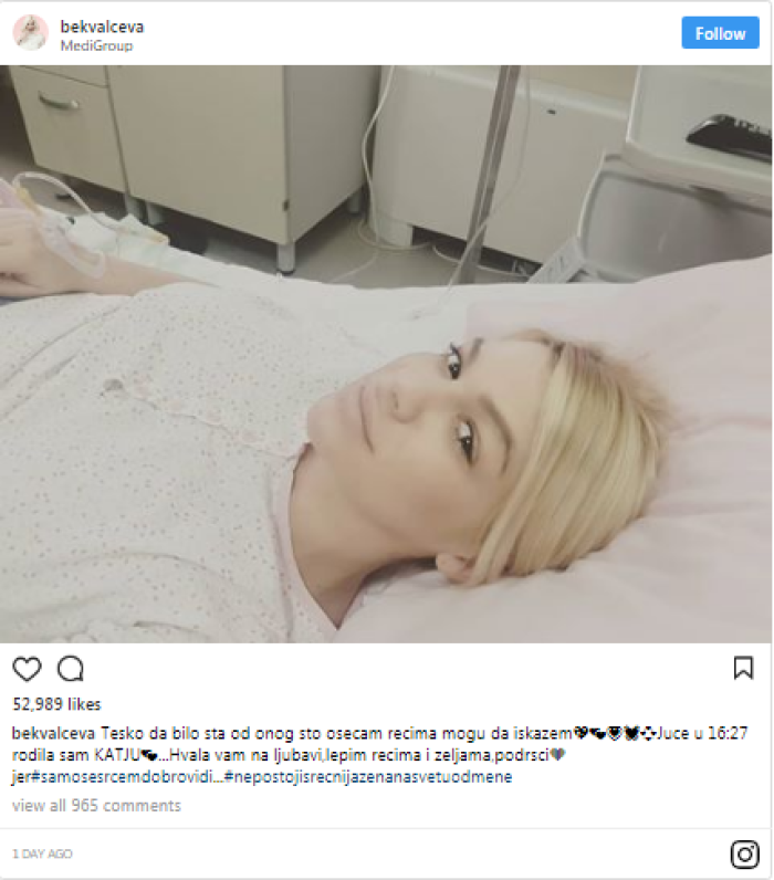 Гордата мајка на својот Инстаграм профил објави фотографија од родилитетот и порача: „Тешко дека било што од она што го чувствуам со зборови можам да го искажам. Катја ја родив на 28.февруари во 16.27 часот. Ви благодарама на љубовта, убавите зборови и желби, на поддршката. Не постои посреќна жена на светот од мене“.