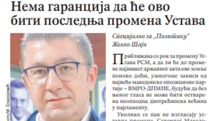Нема гаранции дека ова ќе биде последната промена на Уставот, вели лидерот на ВМРО ДПМНЕ Христијан Мицкоски во денешното интервју за белградска Политика, обвинувајќи ја нашата дипломатија дека не се изборила за подобри позиции и гаранции дека нема да има нови пречки за македонскиот евроинтегративен пат.