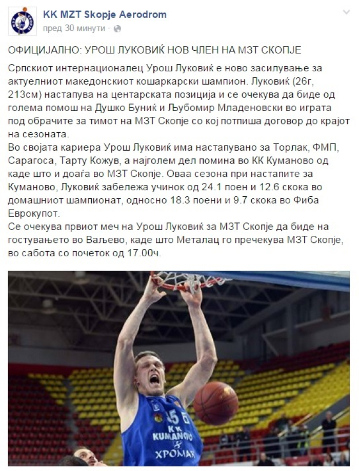 Српскиот интернационалец Урош Луковиќ е ново име во МЗТ Скопје. Актуелниот кошаркарски шампион успеа да ги договори условите со довчерашниот центар на Куманово и со тоа да го зголеми ростерот на оваа позиција. Луковиќ, во текот на оваа сезона за Кумановци забележа учинок од 24.1 поен и 12.6 скокови во домашниот шампионат. 26 годишниот играч во својата кариера има настапувано за Торлак, ФМП, Сарагоса, Тарту Кожув како и Куманово, каде што мина најголем дел од неговата кариера. Неговото деби за новиот клуб би требало да биде во сабота каде што МЗТ во Ваљево ќе игра против Металац во рамките на АБА лигата.
