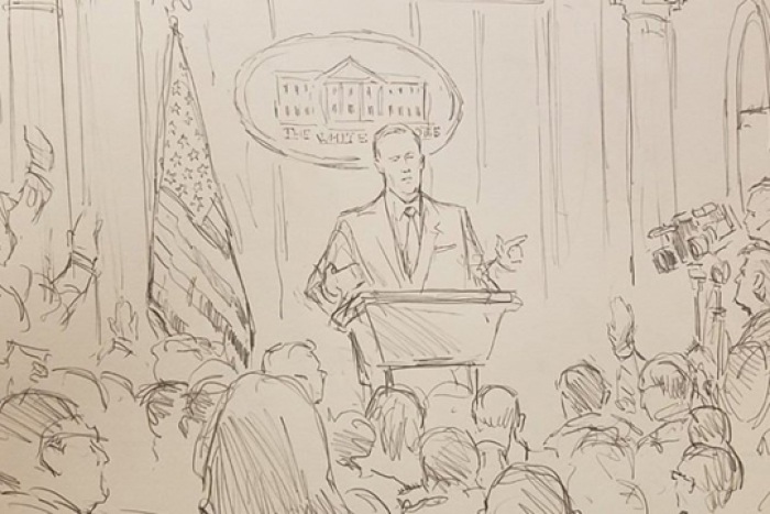 Тие во Белата куќа го испратија ликовниот уметник Бил Хенеси да „ја овековечи“ конференцијата преку цртеж.