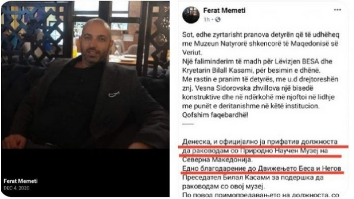 -Денеска, официјално ја прифатив должноста да раководам со Природно-научниот музеј на Македонија. Благодарност до Движењето Беса и до претседателот Билал Касами за поддршката да раководам со овој музеј, напиша Мемети на Фејсбук.