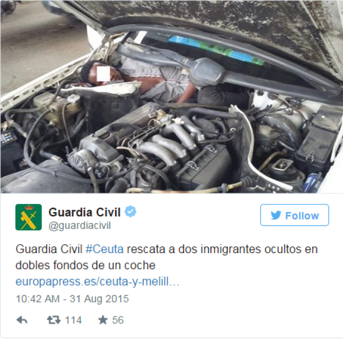 Шпанската полиција на граничниот премин Ел Трајал, пронашла илегални мигранти скриени под хауба на автомобил. Млад човек од Гвинеја лежел завиткан по хаубата, речиси немајќи воздух, но бил подготвен за се за да ја премине границата.