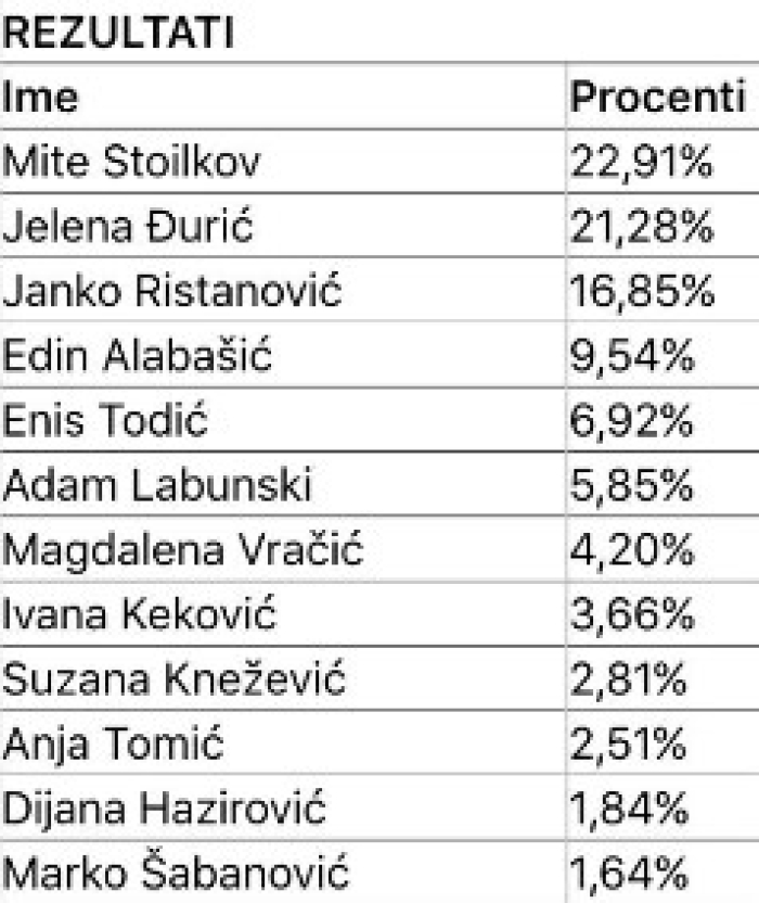 Мите имал 22, 91% од гласовите, со што ја победи второпласираната Јелена која имала 21,28% од гласовите.