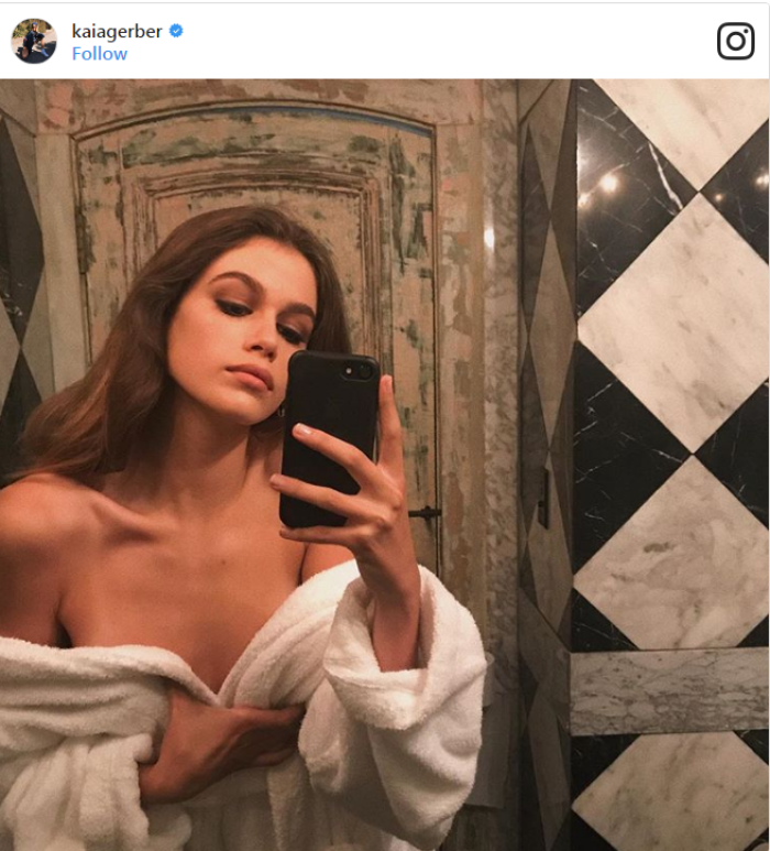 Каиа Гербер, ќерката на Синди Крафодр, ги израдува своите фанови на Инстаграм откако објавила селфи во бањарка, откривајќи ги рамениците и држејќи ја кај пределот на градите.