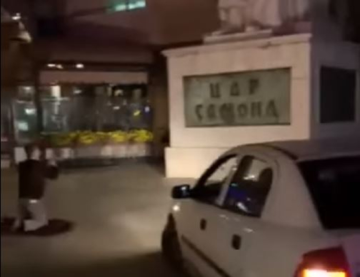 На видеото може да се види возачот како клекнува и се крсти пред споменикот на Цар Самоил.
