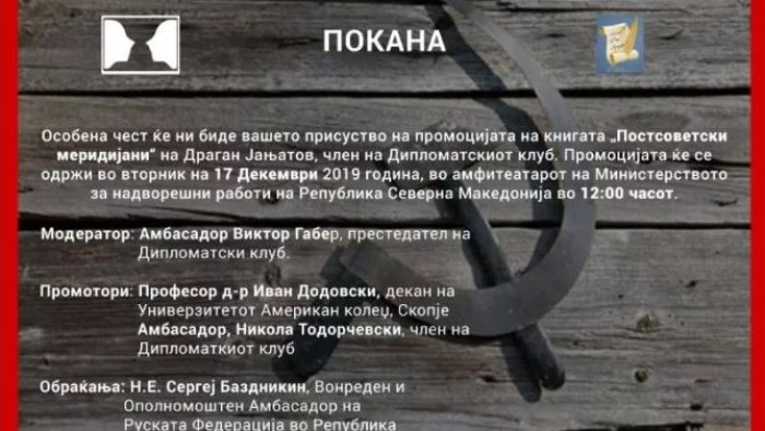 Модератор на промоцијата ќе биде амбасадорот Виктор Габер, претседател на Дипломатскиот клуб, а пред присутните ќе се обрати и авторот Јањатов.