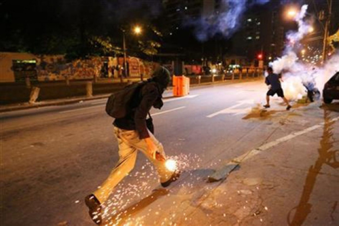 За да ги разбие учесниците на протестот во близина на „Маракана“, каде се одржа свеченото отворање на Игрите, бразилската полиција употреби солзваец и чадни бомби.