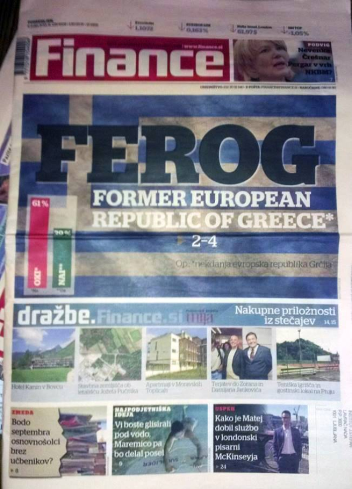 Словенечкиот весник Финанце излезе со насловна страна на која напиша FROG - Former European Republic of Greece (поранешна европска република Грција)
