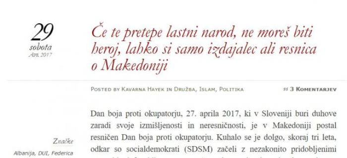 Денот на борбата против окупаторот, 27 април 2017год., кој во Словенија ги разгорува духовите поради својата измисленост и невистина, во Македонија стана вистински Ден на борба против окупаторот. Долго се готвеше, скоро три години, од кога социјалдемократите (СДСМ) почнаа со незаконските придобиени снимени телефонски разговори, од сеуште неразјаснети извори и автентичност, да ја руши легитимно избраната македонска власт. Десно ориентирана, составена од министри од редовите на македонската партија ВМРО-ДПМНЕ и партијата на албанците во Македонија ДУИ. За да би можеле вистински да ја разбереме генезата на сегашните настани во македонското Собрание, мора да погледнеме малку поназад во минатото, пишува во својата анализа словенечкиот портал „Каварна Хајек“ за случувањата во Македонија.