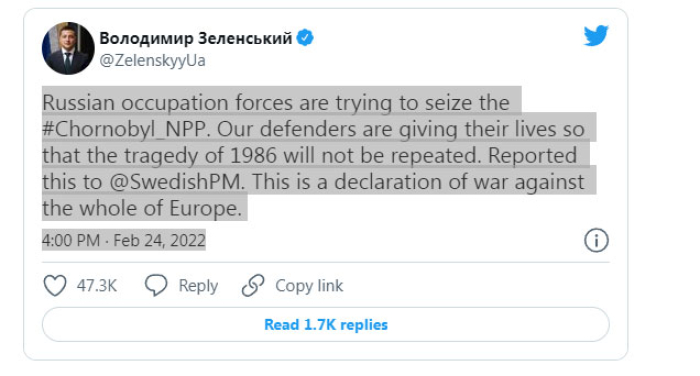 „Руските окупациски сили се обидуваат да ја заземат АЕЦ Чорнобил. Нашите бранители ги даваат своите животи за да не се повтори трагедијата од 1986 година. Тоа го објави денеска украинскиот претседтел Володомир Зеленски на Твитер, нагласувајќчи дека таква порака му пратил на шведскиот премиер.