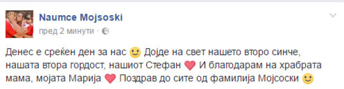 Македонскиот ракометар Научме Мојсоски на социјалната мрежа Фејсбук објави дека станал татко по втор пат. Неговата сопруга Марија денес го родила нивниот втор син.