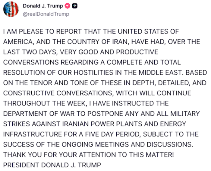Во објава на социјалните мрежи, Трамп истакна дека во изминатите денови се воделе интензивни разговори меѓу двете страни, кои отвораат можност за намалување на тензиите и потенцијално дипломатско решение. Како резултат на тоа, донесена е одлука за привремено одложување на нападите врз клучната енергетска инфраструктура.