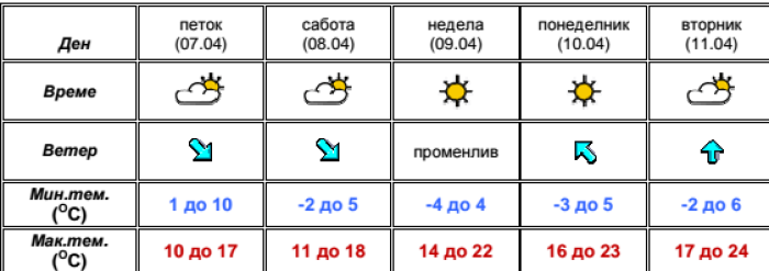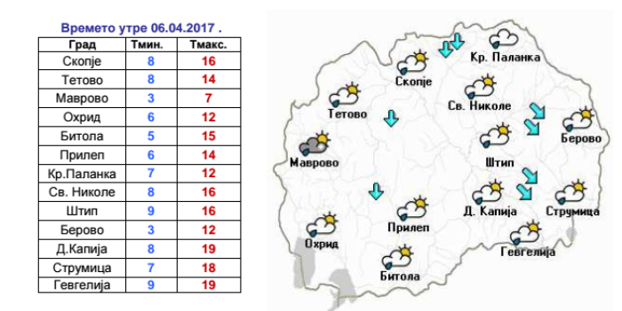 Претпладне врнежите ќе бидат позастапени на исток, а кон крајот на денот и во текот на ноќта во западните делови од земјава каде на планините и на некои повисоки места се очекува да има и врнежи од снег. Од утре до сабота ќе дува умерен до засилен северен ветер, поизразен вдолж Поварадрието.