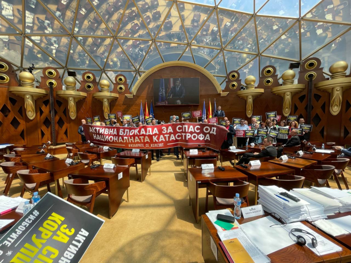 Пратениците на ВМРО-ДПМНЕ и на останатите партии членки на коалицијата „За обнова на Македонија“ од вторникот ја започнаа најавената „активна блокада“ на Собранието, за која тврдат дека ќе трае се до постигнување договор за датум за предвремени парламентарни избори.