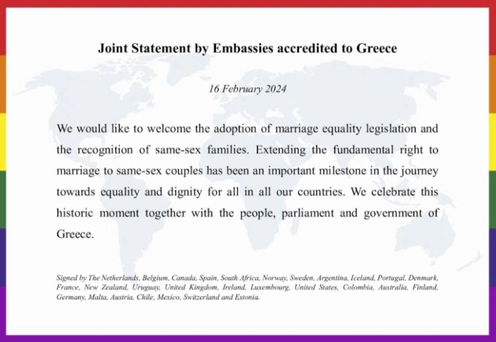 Со заедничка изјава, 28 странски амбасади во Грција го поздравија синоќешното изгласување на законот за истополовите бракови, коментирајќи дека станува збор за историски момент, јави дописничката на МИА од Атина.